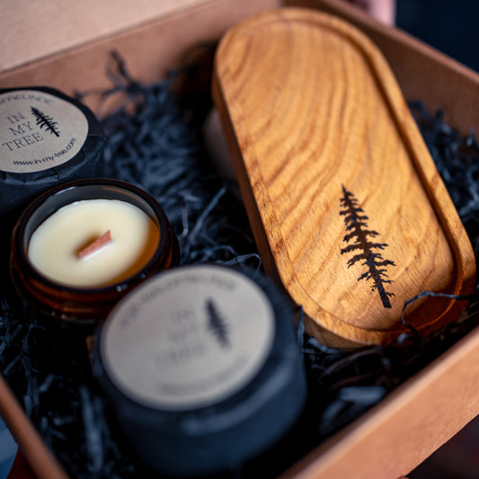 Geschenkset mit drei 100 gr Rapswachskerzen und einem Holztablett "Wood and Soul" in 18 x 8 cm